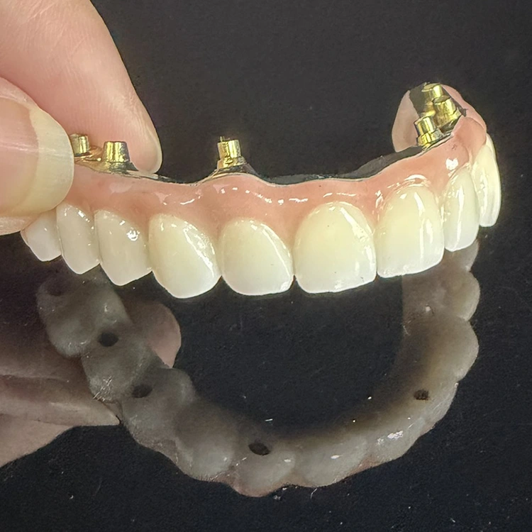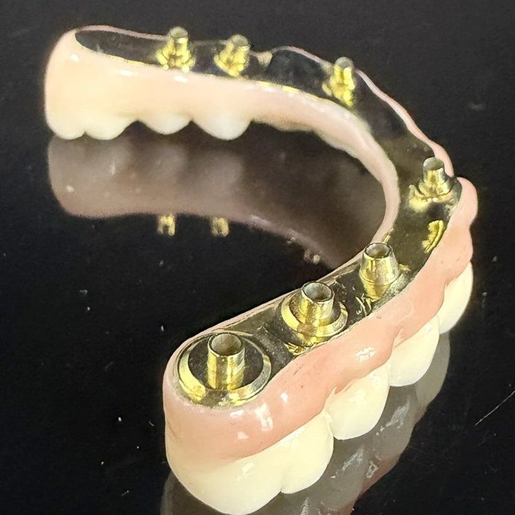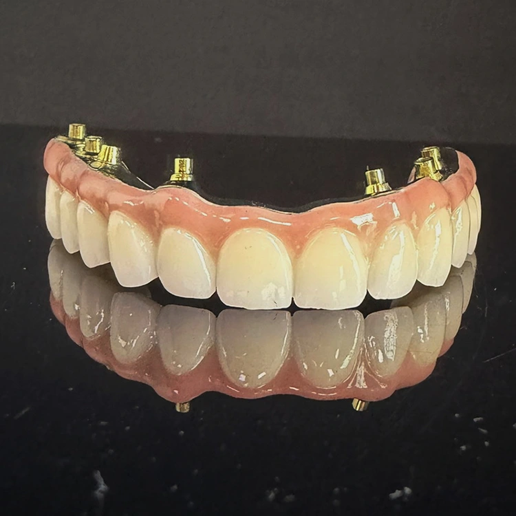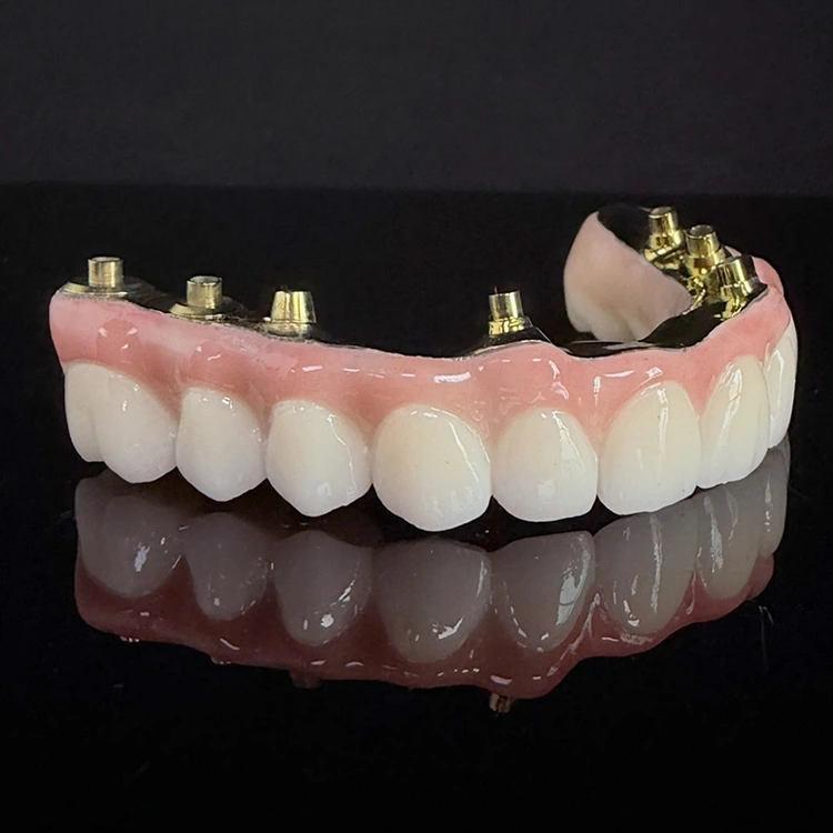 Хибрид са пуним луком на мосту од 6 цирконијума преко титанијумске стоматолошке шипке, потпуно брушени цирконијум и потпуно брушени титанијум са естетском ружичастом гумом из кинеске стоматолошке лабораторије ВМ Дентал лаб